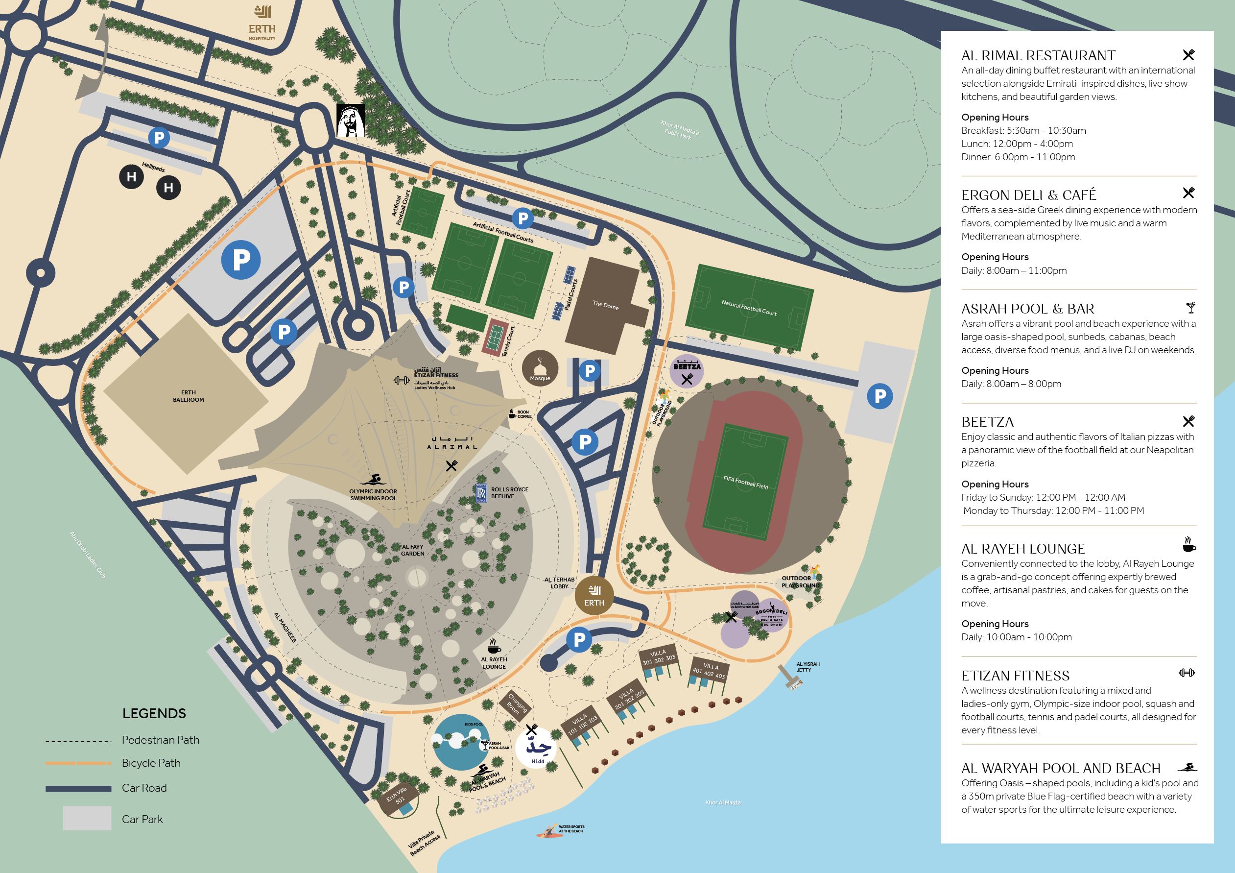 "إرث" هو جزء فريد من الموروث الدائم للمغفور له – بإذن الله تعالى – الشيخ زايد بن سلطان آل نهيان، الأب المؤسس لدولة الإمارات العربية المتحدة. في عام 1983، أراد الشيخ زايد إنشاء مساحة ترفيهية مخصّصة لضباط القوات المسلحة الإماراتية في قلب مجتمع مدينة أبوظبي. تقام على مساحة 75 هكتاراً من الارض فيما كان يعرف آنذاك بالحافة الجنوبية الشرقية لمدينة أبوظبي.